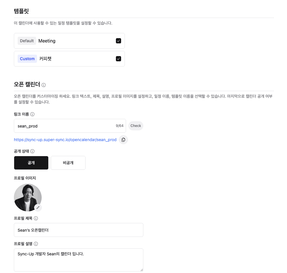 메뉴 > 캘린더 버튼 위 톱니바퀴 버튼을 통해 캘린더 설정에 들어갈 수 있습니다. 설정에서 예약 탬플릿을 선택해 오픈 캘린더를 생성하면 끝! 모든 준비가 끝났습니다.