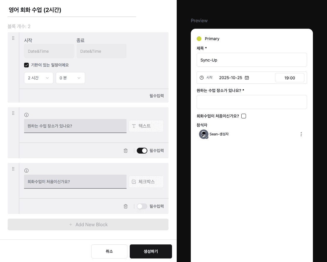 비즈니스마다 필요한 예약 정보가 다르기 때문에 커스텀이 가능합니다.
